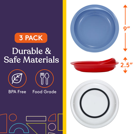 Special Supplies Adaptive Spill-Proof Scoop Plates- Dishes with Wall for Disabled, Elderly Adults with Special Needs from Parkinson's, Dementia, Tremors- 3 Pack (White, Blue, Red)