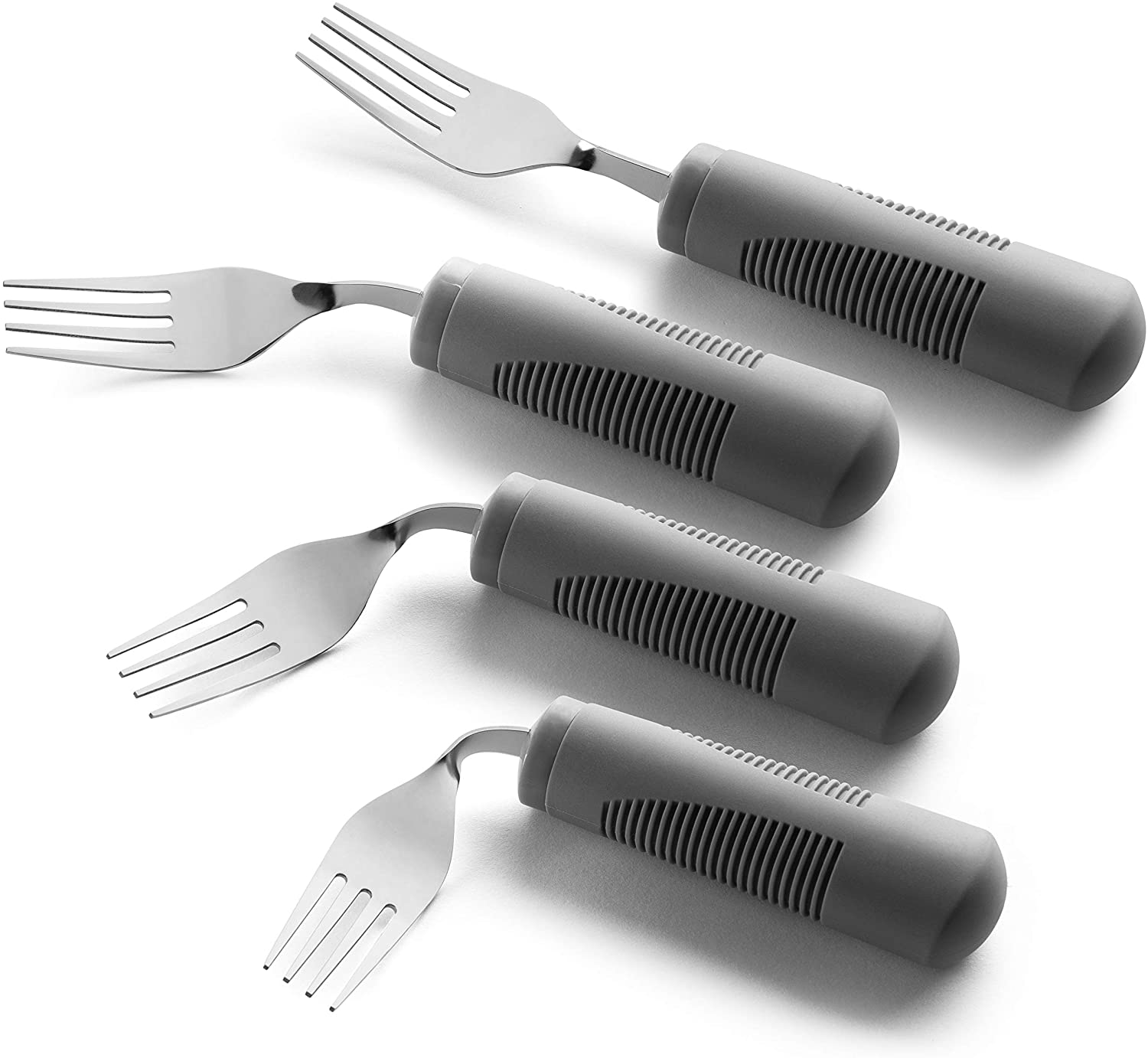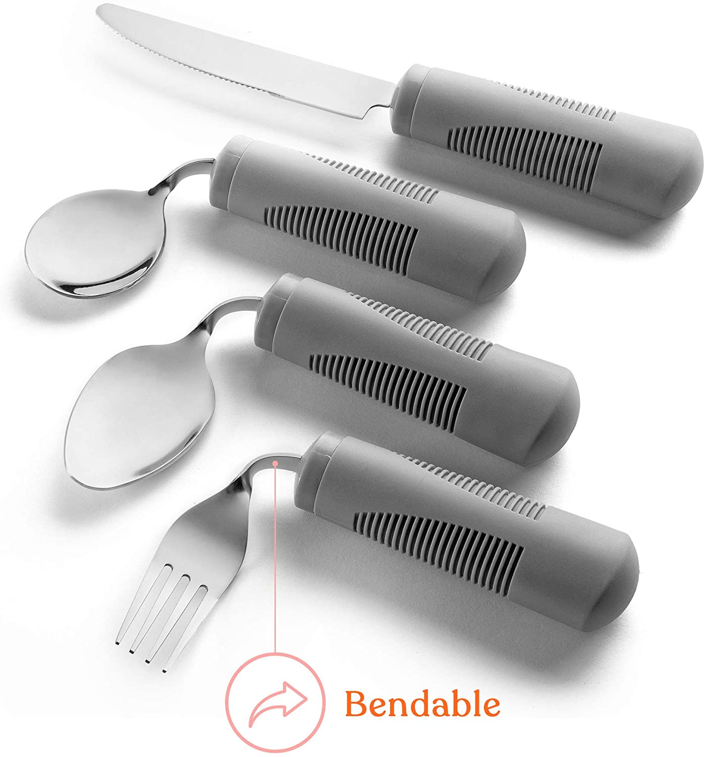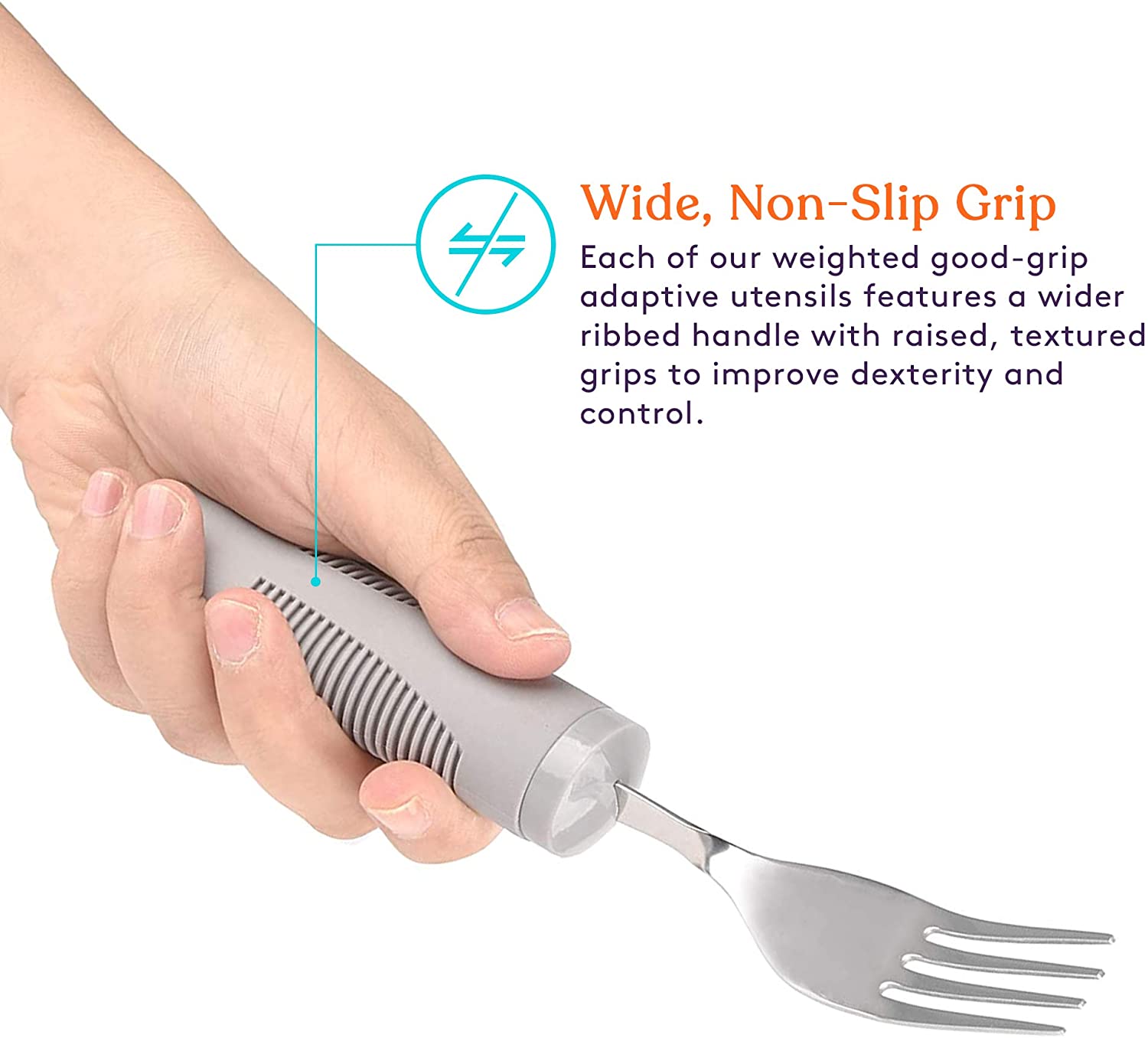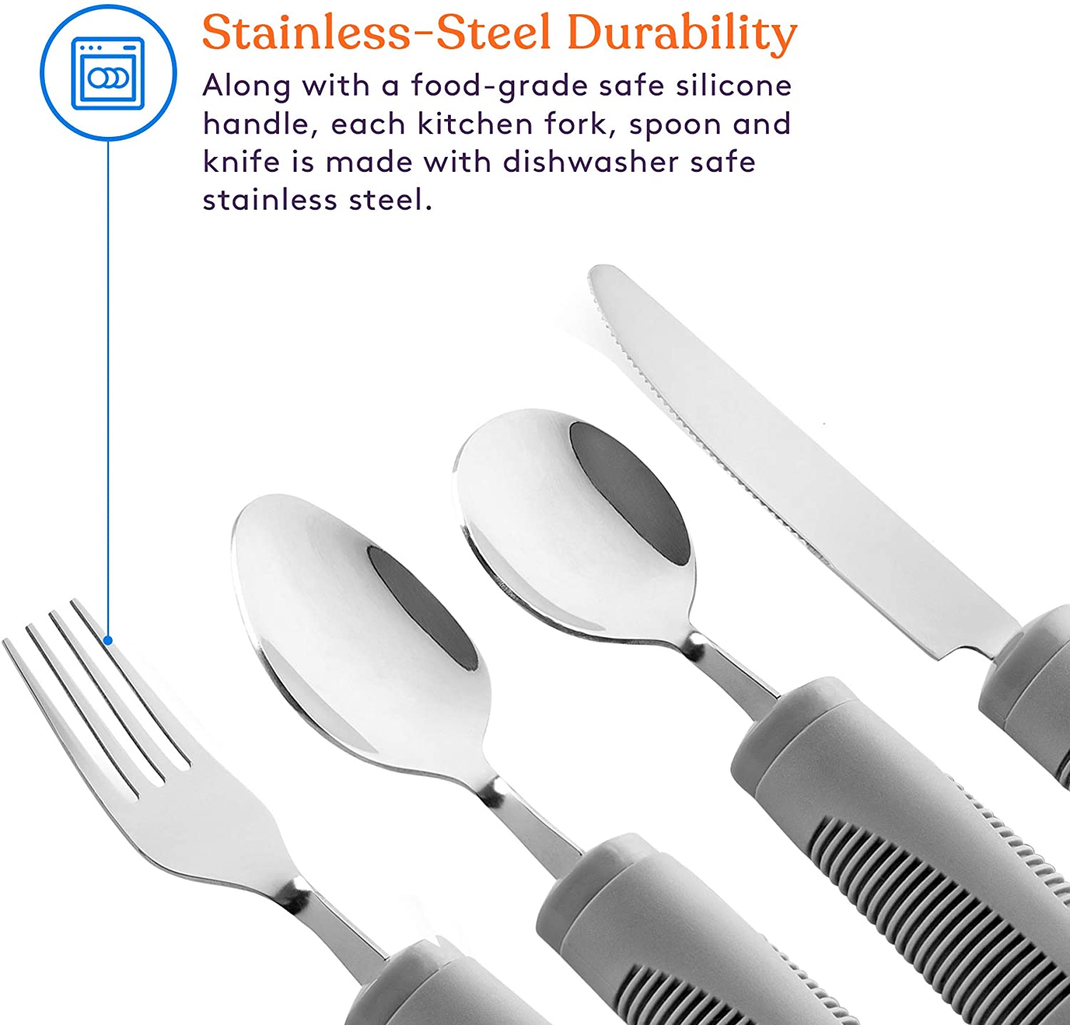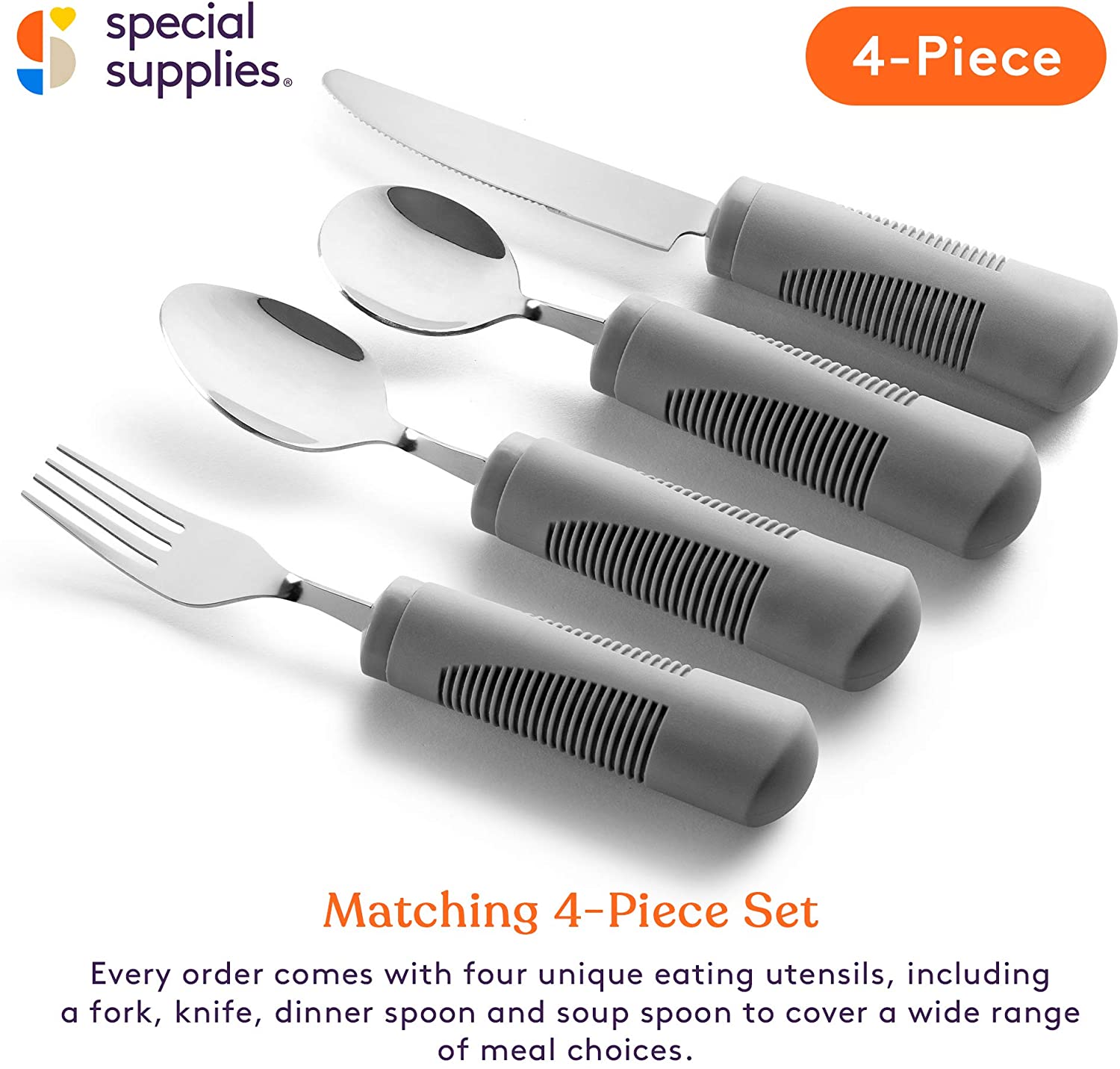 The good grip easy grip utensil set is a 4 pack of silverware with premium rubber handles for easy holding. These utensils feature a heavy thick handle and premium steel tips that are designed for use by anyone who suffers from dexterity issues. They are discreet and dishwasher safe and are protected by a 60-day warranty.