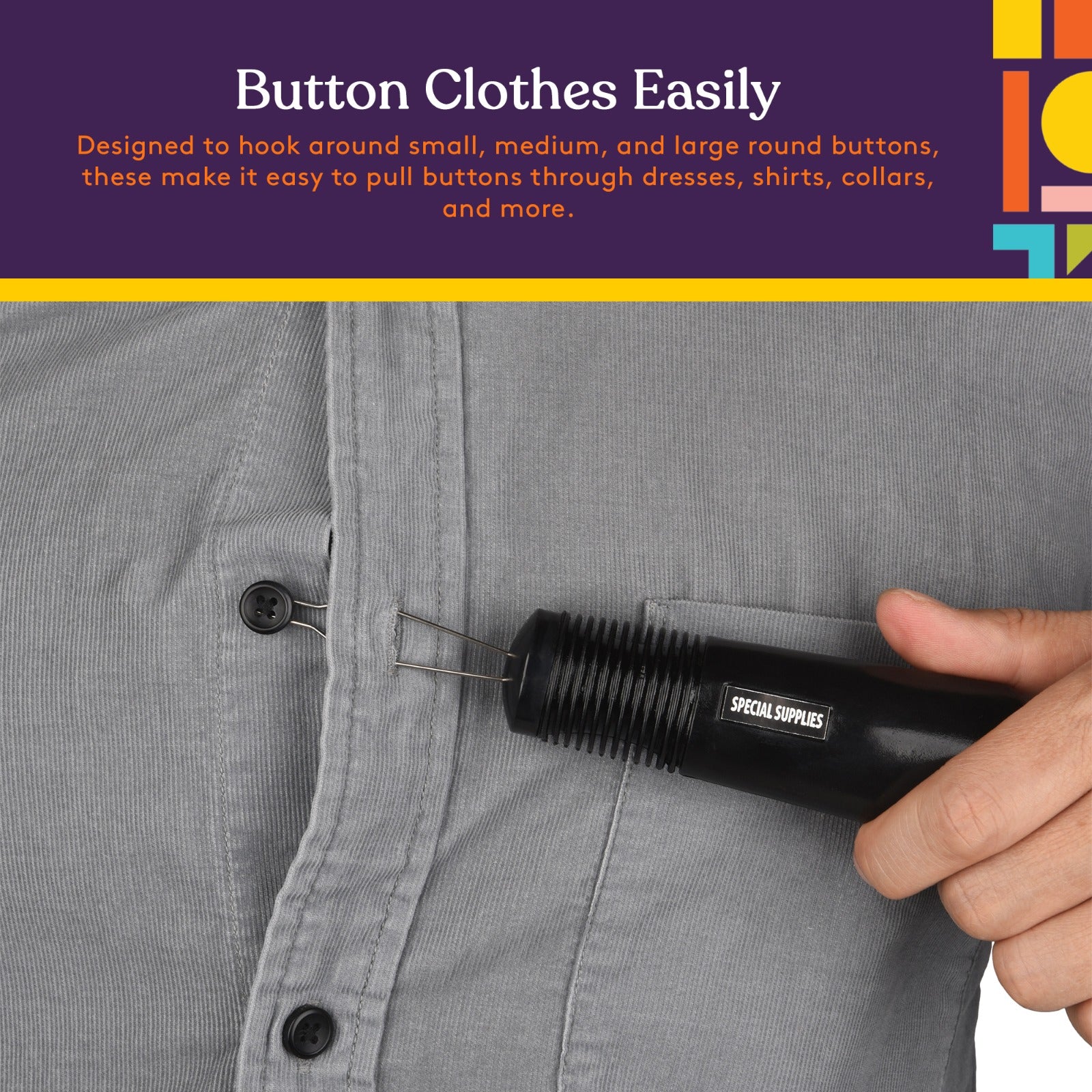 Avoid struggling with small buttons on your shirt, dress, or clothing by pulling them through easily and smoothly with a Special Supplies Button Hook.