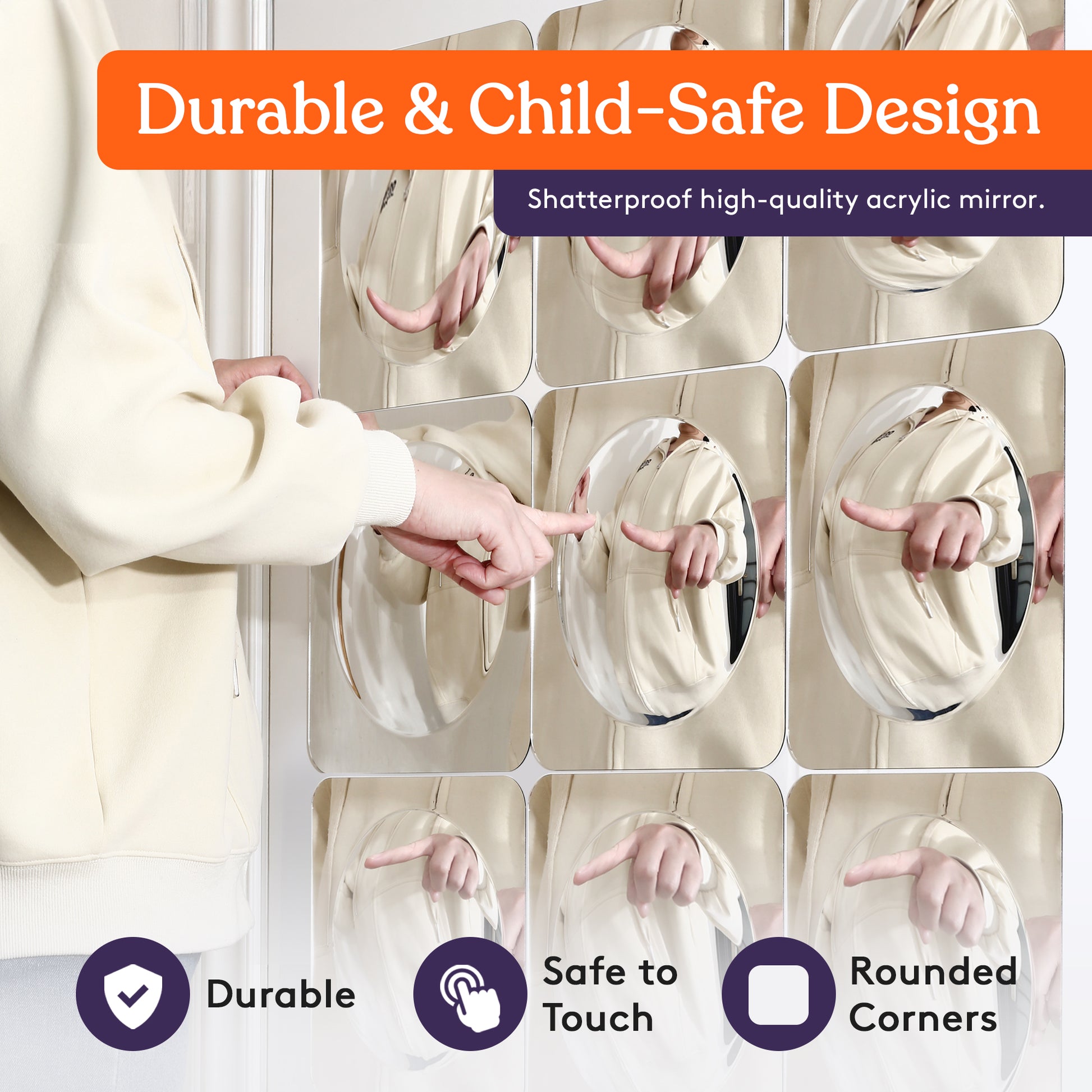 The adhesive mirror is designed with safety and durability in mind. Crafted from high-quality acrylic, this unbreakable mirror for kids ensures a safe play experience for toddlers. This baby mirror toy is lightweight and easy to install on any wall. It transforms any bedroom or playroom into a delightful nursery mirror. It also promotes self-awareness and emotional development, making it an essential addition to a sensory room or kids bedroom or playroom. This small mirror for wall can also be used as a room mirror, adding a touch of retro decor and inspirational wall decor to your space.