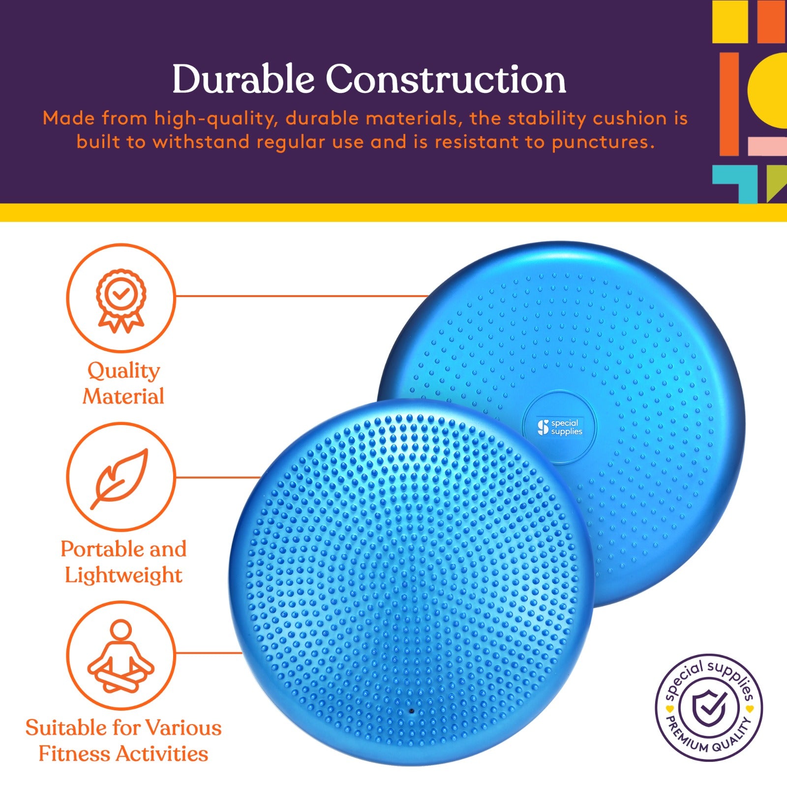 Improve core strength, balance, and flexibility with a Special Supplies sensory wobble cushion that supports fitness and therapy.